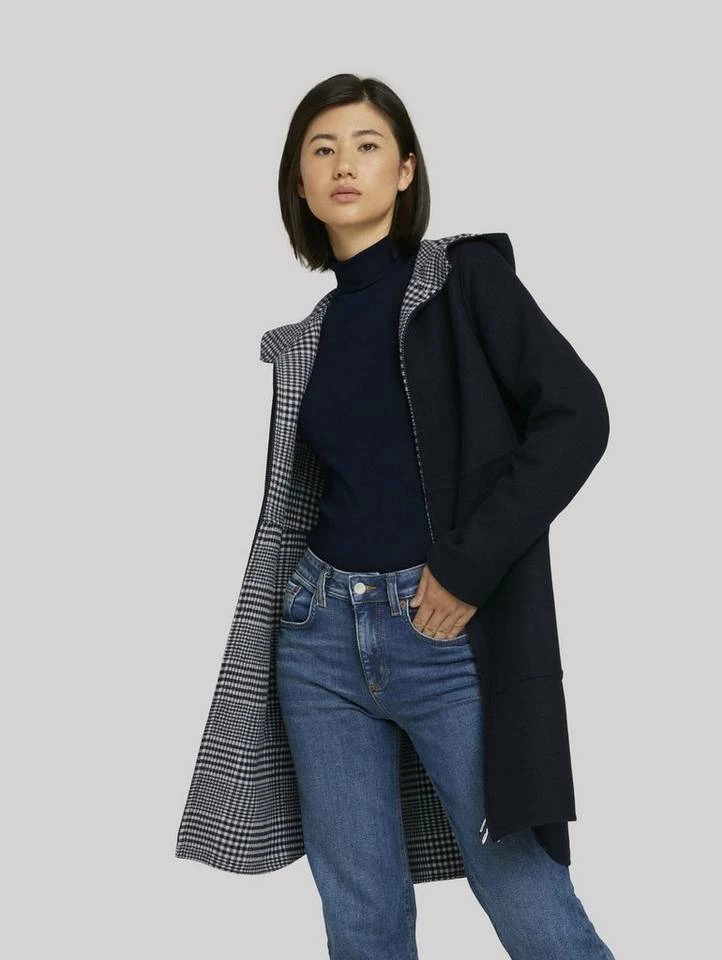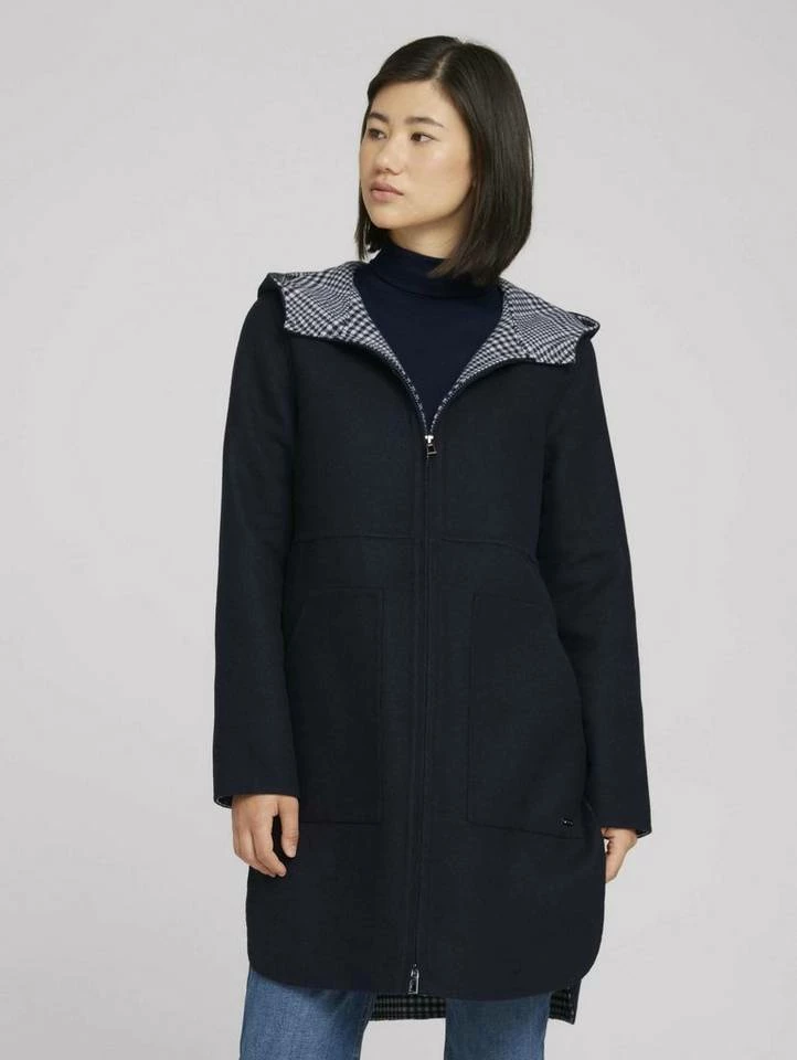 Wollmantel mit Kapuze für Frauen (langärmlig mit Kapuze und Reißverschluss) mit weichem Wollanteil, Eingrifftaschen auf der Front, mit kariertem Innenfutter