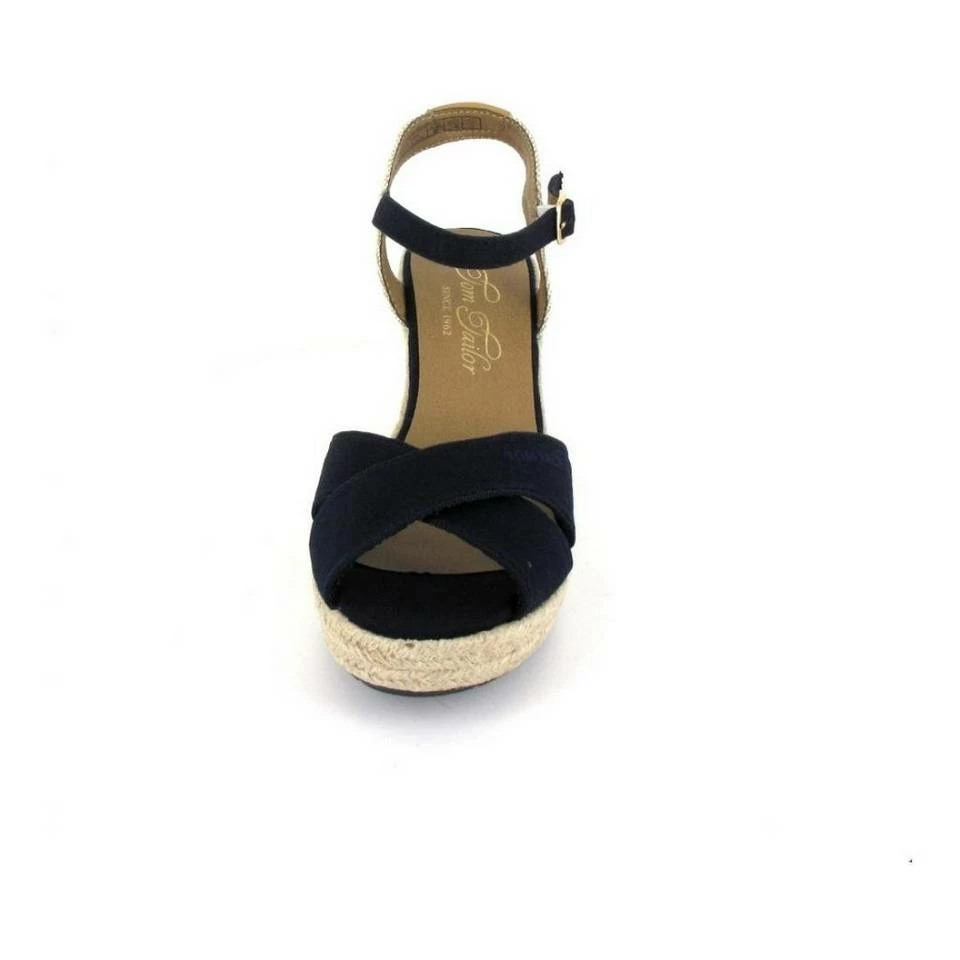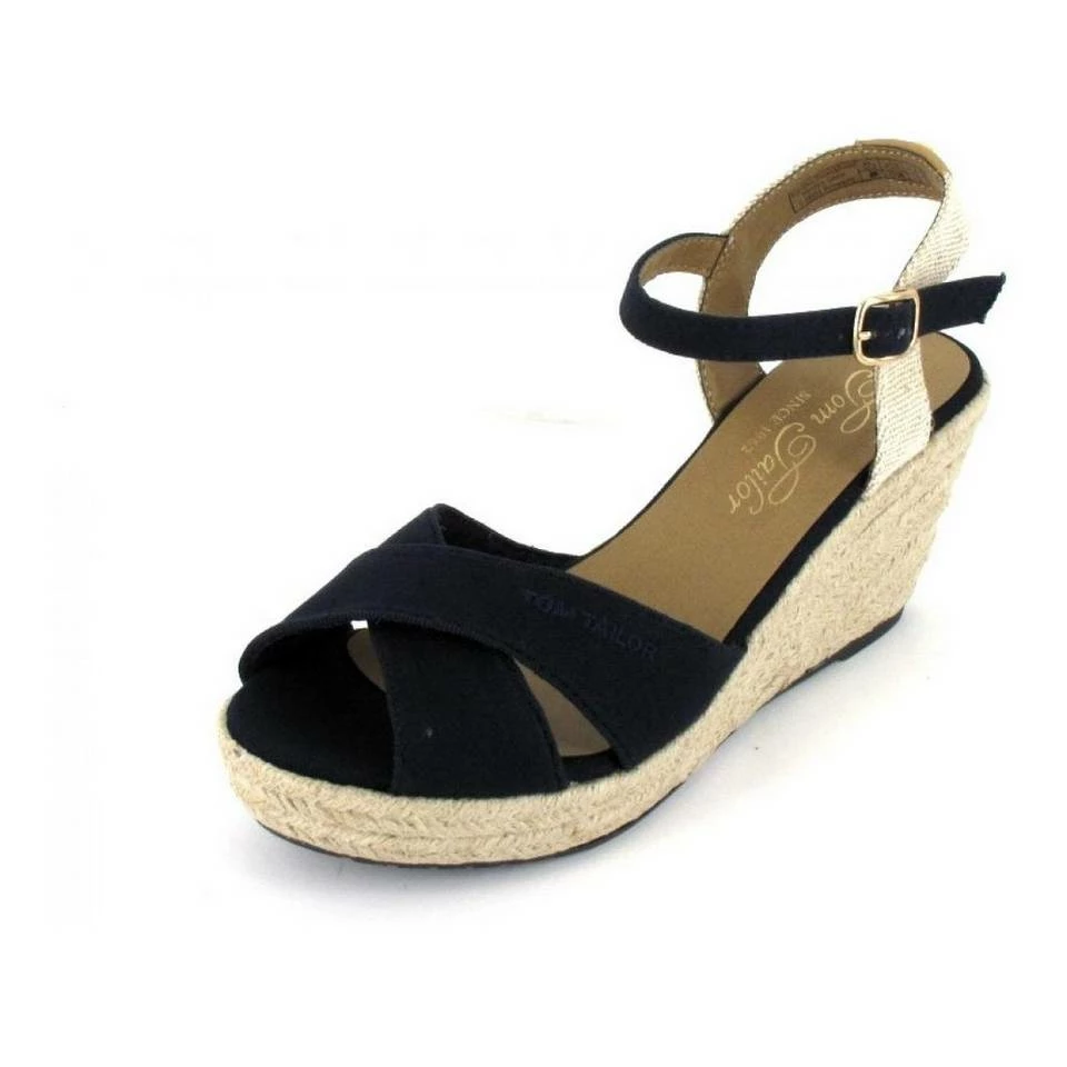 – Damen Keilsandalette in der Farbe Blau von der Marke Tom Tailor – weiche und bequeme Innensohle – beste Anpassung an den Fuß und leichten Einstieg durch den Riemen mit Schnalle an der Ferse – der Keilabsatz ist in geflochtener Bast-Optik gehalten